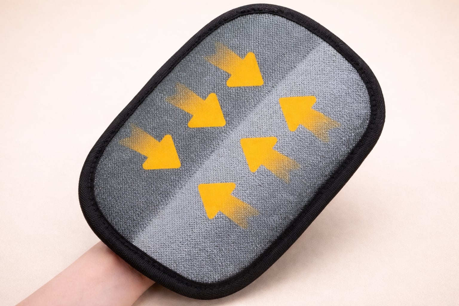 Forma rękawicy sprawia, że korzystanie z niej jest intuicyjne. Zakładasz ją na rękę i wykonujesz naturalne ruchy — jak przy głaskaniu czy przecieraniu powierzchni. Nie obciąża dłoni, dociera do trudno dostępnych miejsc i sprawdza się nawet w biegu, na przykład tuż przed wyjściem z domu.